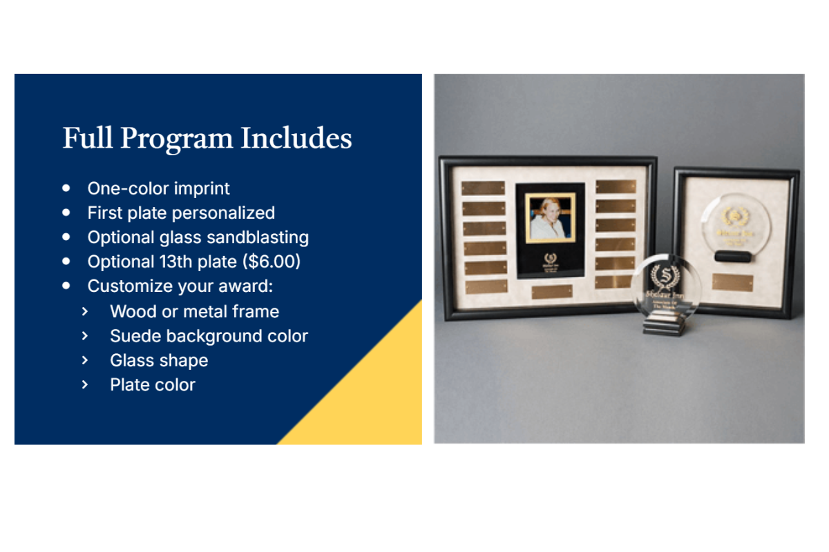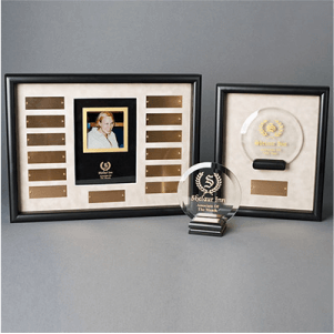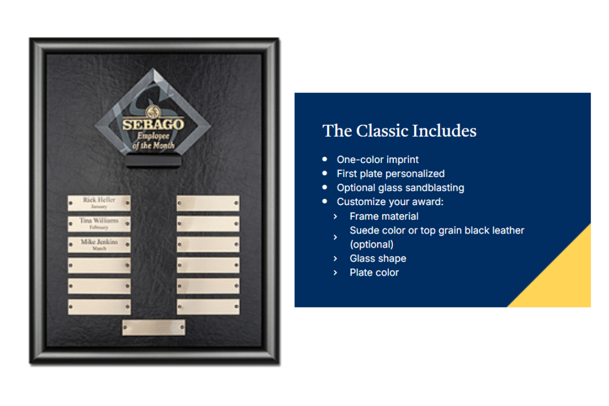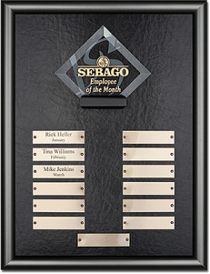 Simple, yet elegant, your employee will feel appreciated when they receive these spectacular awards. Handsomely framed in wood or metal, the master plaque has gold or silver nameplates honoring monthly award winners throughout the year. Include a 13th plate for employee of the year.