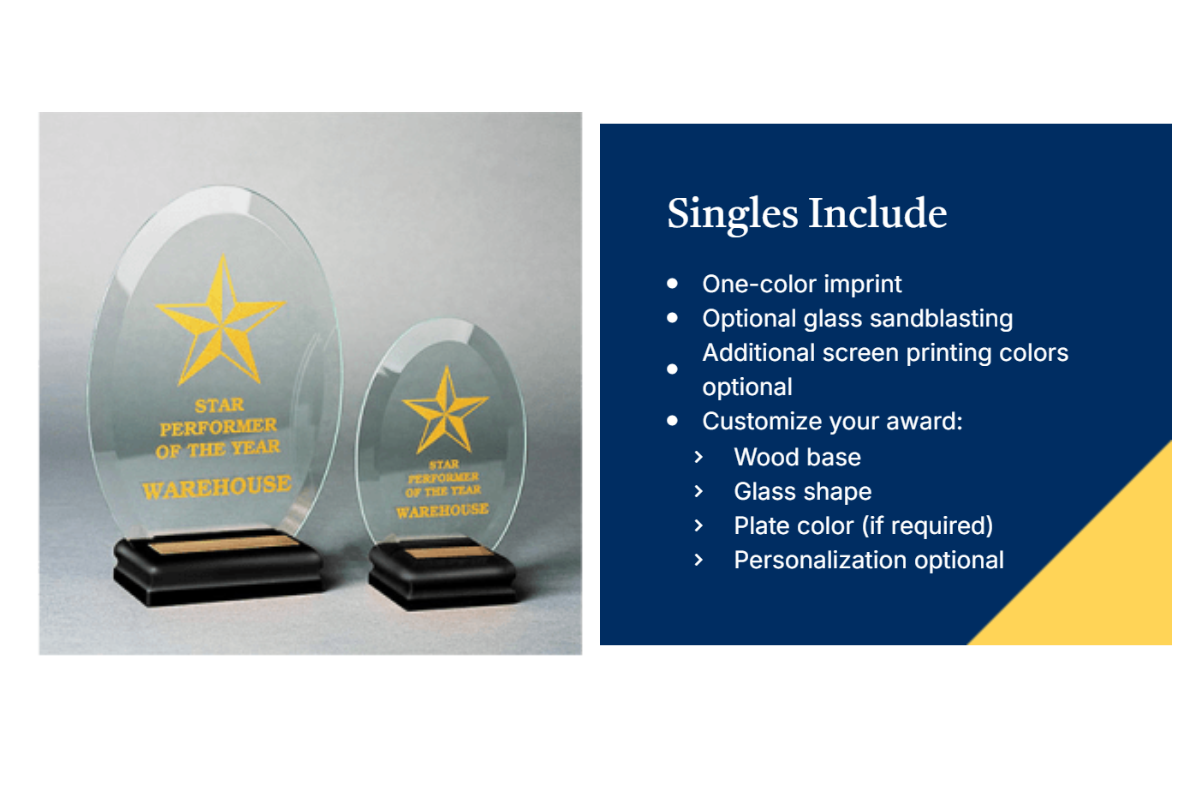 These beveled glass awards are a perfect alternative to a trophy. Displayed on a stylish wood base, a one-color imprint is included in the price. These affordable pieces are an excellent companion to any perpetual plaque.